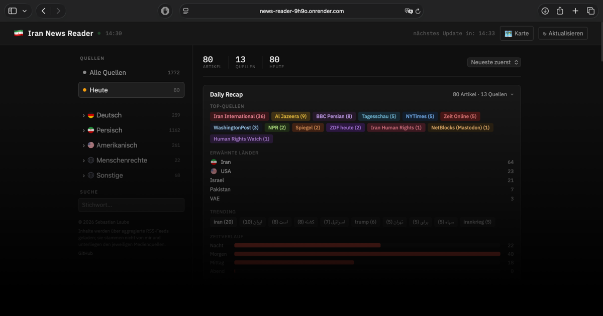 A lightweight, responsive web reader for Iran-related news from various RSS feeds. Built by Sebastian Laube, this app loads content directly from the sources — it does not store its own articles but aggregates and filters existing feeds.